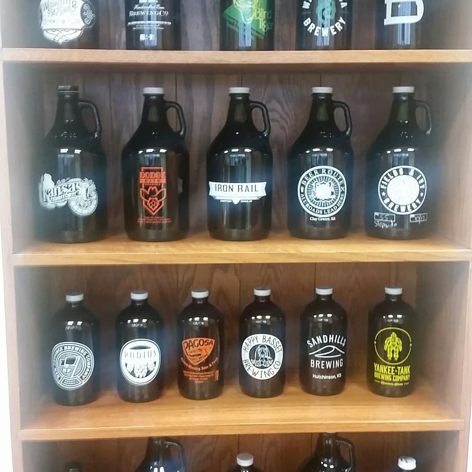 A sampling of growlers collected while touring. On display in Wichita, KS.